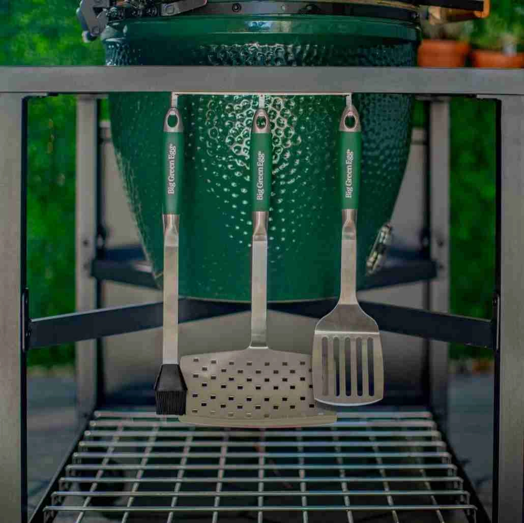 Setul de instrumente personalizate pentru gratar Big Green Egg include o spatula traditionala pentru gratar, o spatula lata multifunctionala si o perie la indemana pentru ungere din silicon. Toate cele trei instrumente sunt disponibile si individual. Manerul foarte lung din otel inoxidabil pentru a pastra distanta fata de caldura data de carbuni. Manerele sunt conturate pentru a oferi o prindere confortabila si sigura.
