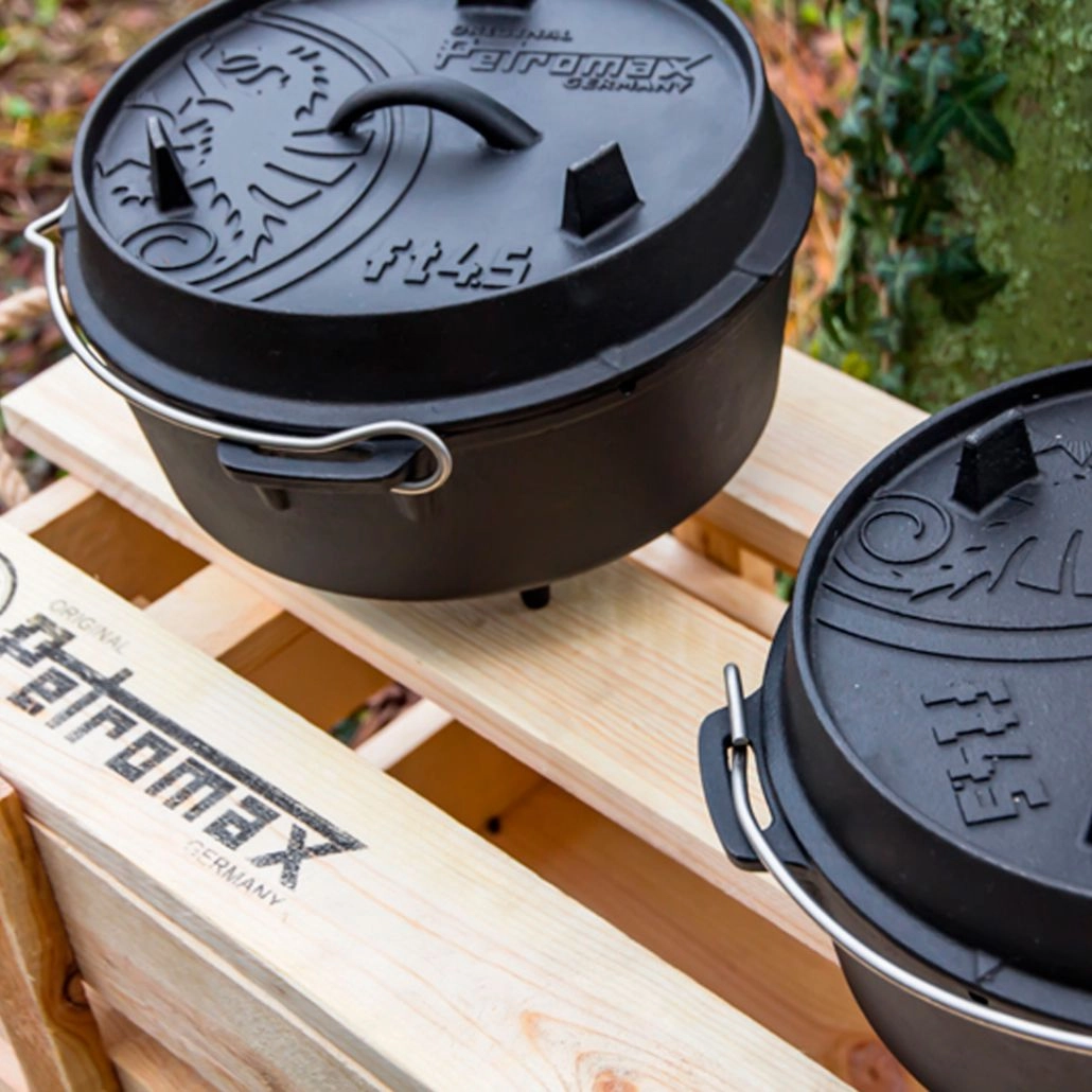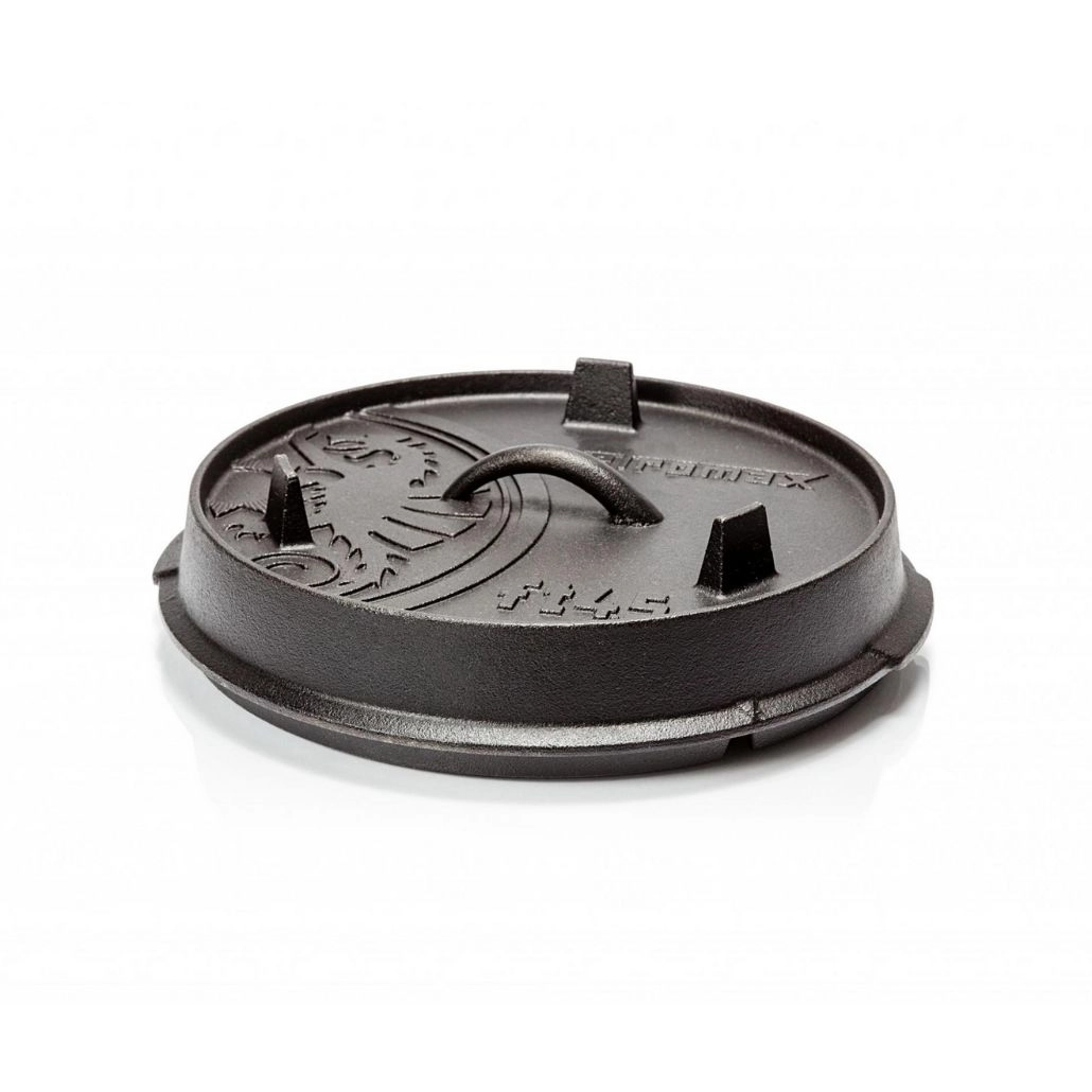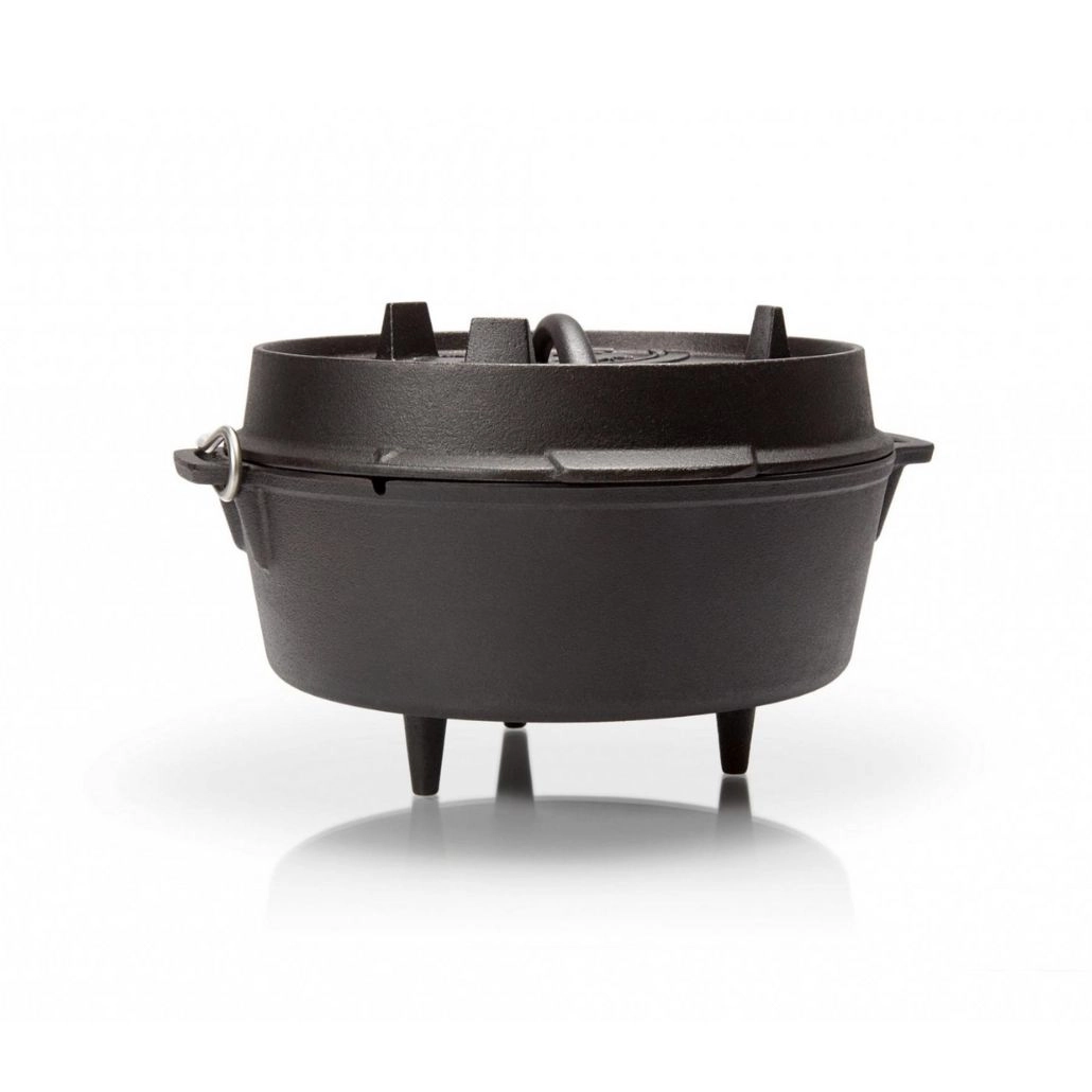 Acest ceaun din fonta are trei picioruse si o capacitate maxima de 4.5 litri, ideal pentru a gati 2 pana la 5 portii. Este perfect pentru prepararea traditionala in aer liber, in jurul focului. Poate fi folosit si in jar de carbuni sau lemne. Capacul multifunctional il transforma intr-o tigaie sau platou. Un instrument versatil pentru gatitul in aer liber.
