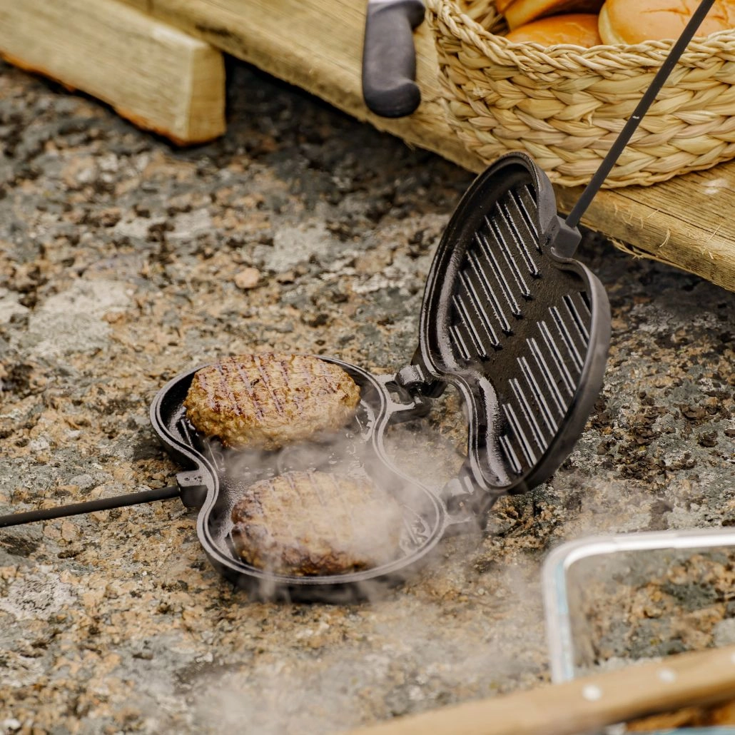 Cu forma Petromax, puteti pregati burgeri perfecti in aer liber. Fiecare forma rotunda are un diametru de 12 centimetri si prezinta o suprafata striata pentru modelul caracteristic de gratar. Datorita proprietatilor de retinere a caldurii, burgerii sunt bine patrunsi in foc si apoi gatiti perfect cu caldura residuala. Forma este prevazuta cu manere din lemn si un carlig de inchidere pentru o manevrare sigura si usoara. Curatarea este simpla, deoarece cele doua forme pot fi usor separate si curatate individual.
