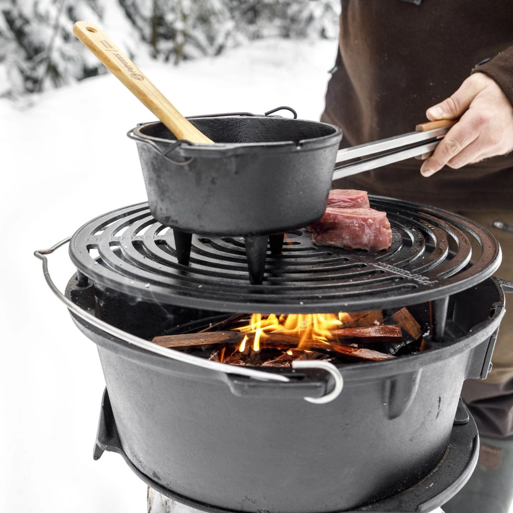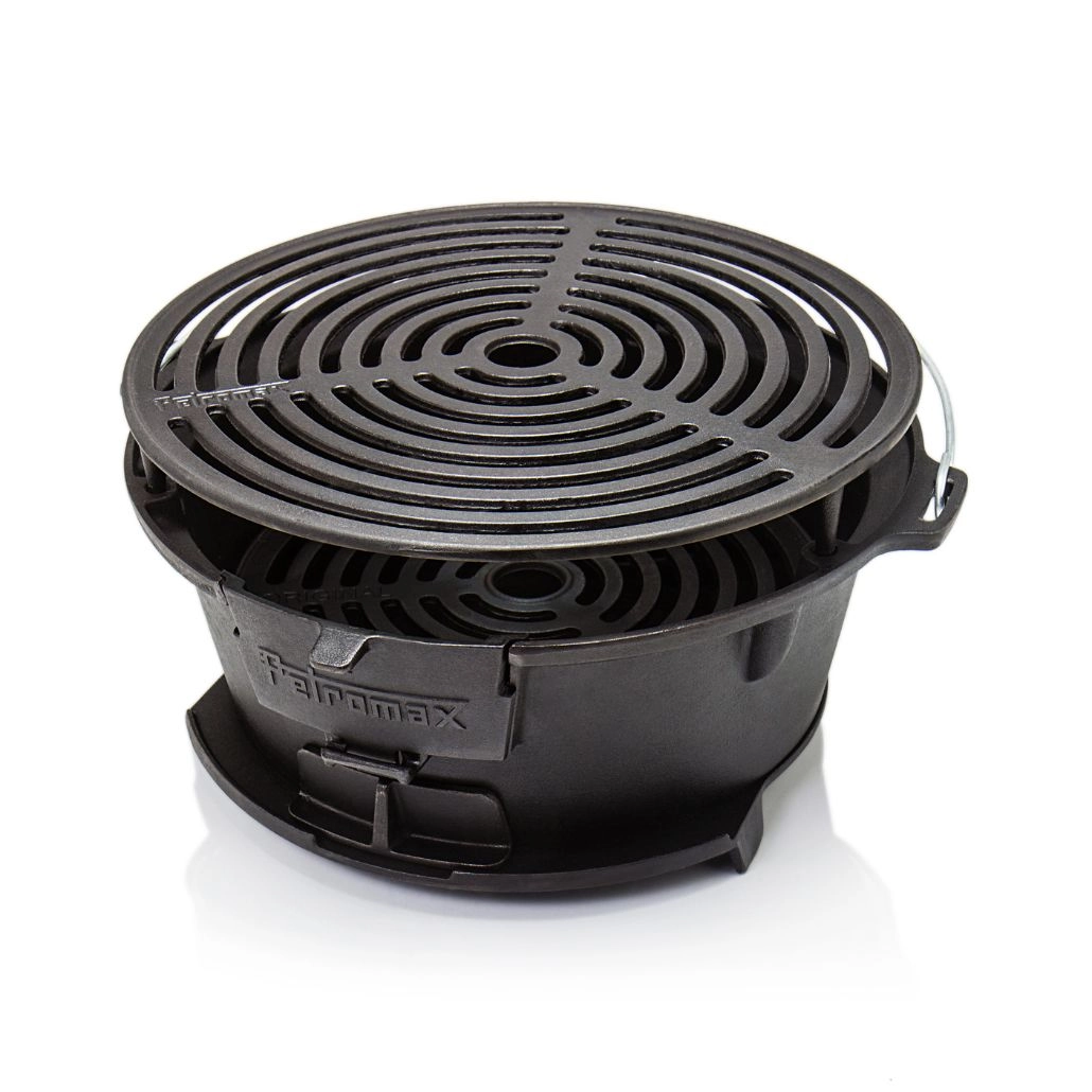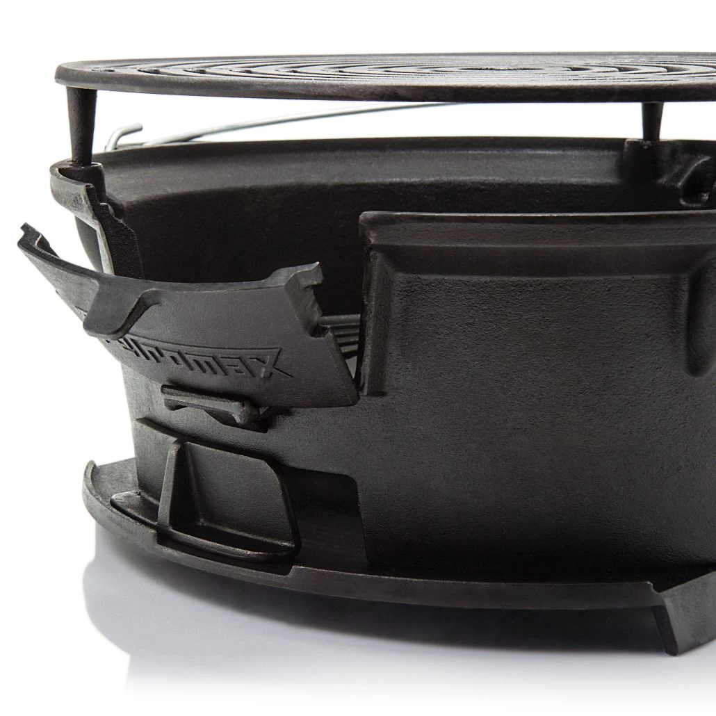 Gratarul din fonta ajustabil pe doua inaltimi de la Petromax este ideal pentru a gati diverse tipuri de carne si legume pe carbuni. Robust si usor de manevrat datorita manerului sau, acest gratar este conceput pentru a fi utilizat cu carbuni si brichete, avand chiar si un orificiu pentru alimentarea cu carbune in timpul gatitului. Potrivit pentru ceaune olandeze de pana la 14 litri, acest gratar este alegerea perfecta pentru aventurile la picnic sau camping.