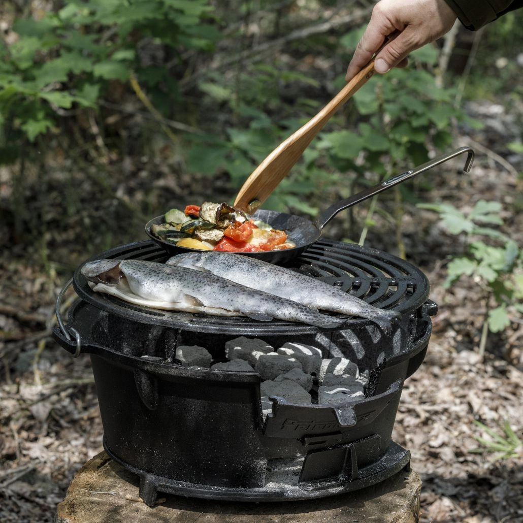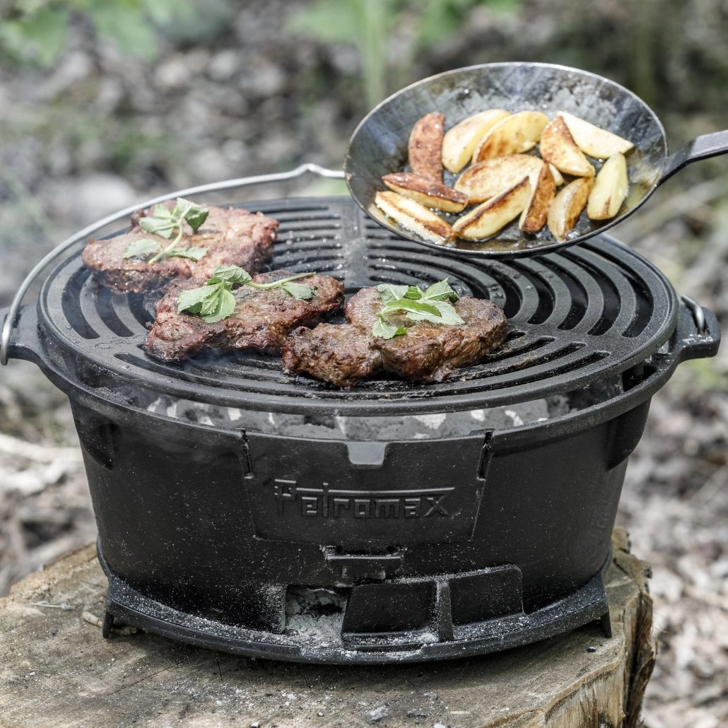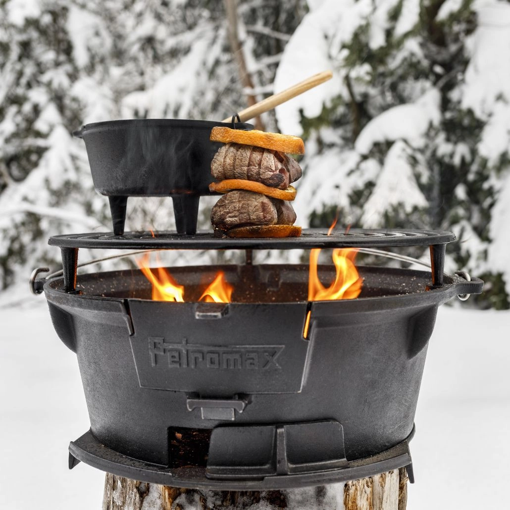 Gratarul din fonta ajustabil pe doua inaltimi de la Petromax este ideal pentru a gati diverse tipuri de carne si legume pe carbuni. Robust si usor de manevrat datorita manerului sau, acest gratar este conceput pentru a fi utilizat cu carbuni si brichete, avand chiar si un orificiu pentru alimentarea cu carbune in timpul gatitului. Potrivit pentru ceaune olandeze de pana la 14 litri, acest gratar este alegerea perfecta pentru aventurile la picnic sau camping.