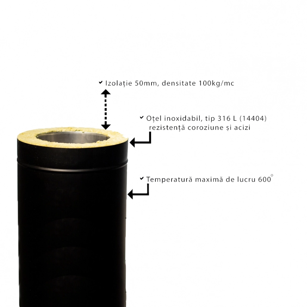 Gasesti diametre intre fi 150 si fi 250 cu preturi pentru toate elementele componente, iar la cerere si pentru diametre mai mari. Sistemul de tip dublu perete, cu grosime mare a vatei izolatoare de 50 mm, permite o temperatura foarte ridicata de lucru, de pana la 600*C. Este destinat pentru constructia evacuarilor de gaze arse umede de la surse de incalzire moderne, economice, pe ulei, gaz sau lemne, avand rezistenta ridicata la coroziune, intemperii si mediu acid. Fabricat din materiale de calitate superioara: traseul interior al cosului de fum este confectionat din otel Inoxidabil tip 1.4404 in conformitate cu DIN17441 (AISI 316L), iar la exterior otel galvanizat vopsit electrostatic negru, transformandu-l intr-un horn aspectuos.