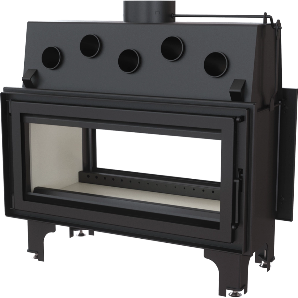 Focar tip tunel, cu geam pe partea din fata si spate, ideal pentru constructia semineelor intre doua incaperi. Semineul dispune de usa cu maner pe ambele parti, pentru o alimentare mai usoara cu lemn si pentru o curatare facila a sticlei acestuia. Focarul este echipat la nivelul conului cu sistem de recuperare a caldurii, compus din tevi orizontale ce preiau din caldura gazelor de evacuare, crescand eficienta acestuia. Datorita samotei din interior si a arderii pe vatra, procesul de ardere al lemnului este mai amplu, rezultand reziduri de cenusa reduse.