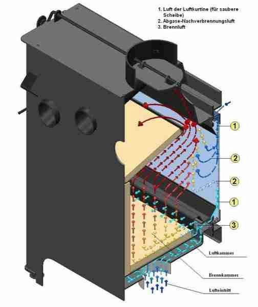 Procesul de ardere se desfasoara pe vatra (fara gratar), rezultand altfel o ardere cat mai completa si reziduuri de cenusa cat mai scazute, energia termica obtinuta din lemn de foc fiind exploatata la maxim.