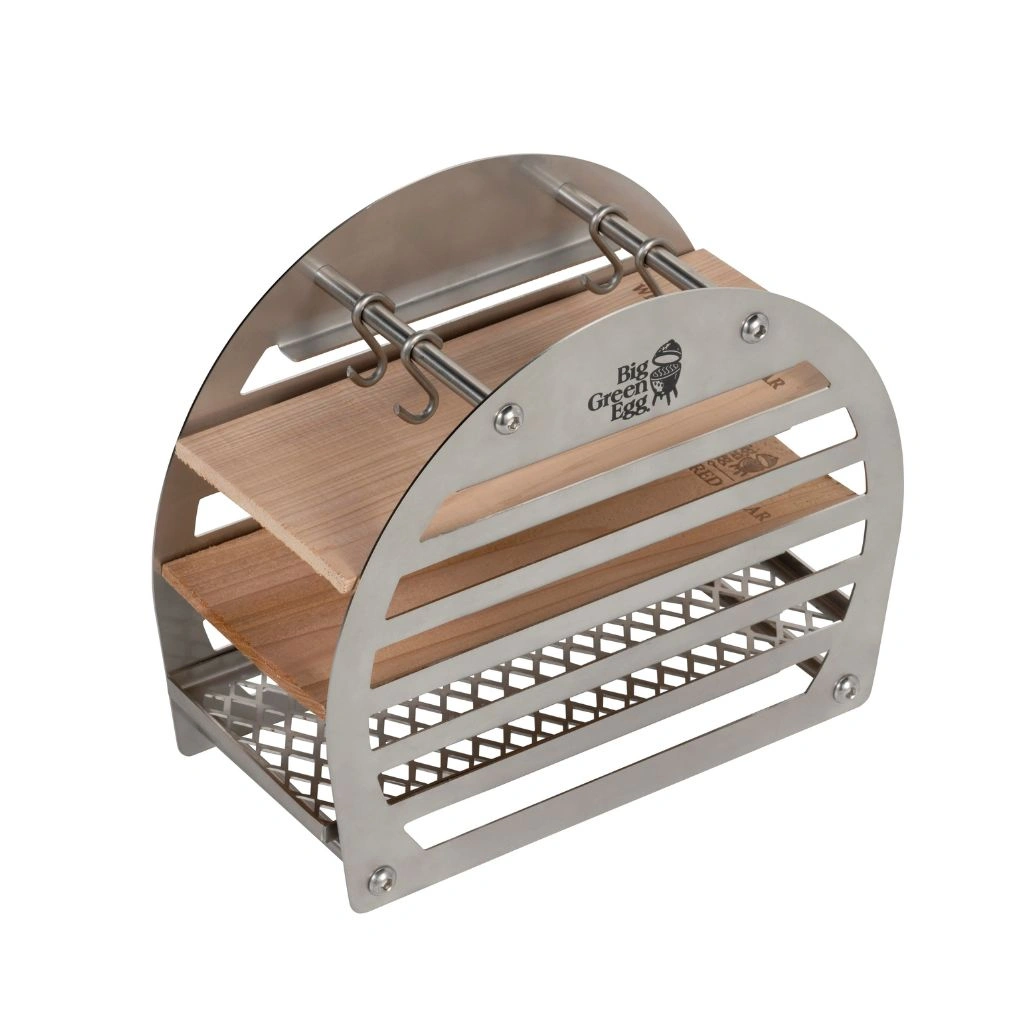 Suortul pentru afumare este un accesoriu versatil pentru gatit pe mai multe niveluri, ideal pentru afumarea si prepararea simultana a diferitelor tipuri de alimente. Acesta include un gratar din otel inoxidabil, doua placi de gratar din lemn de cedru si carlige pentru agatarea carnii sau pestelui. Poti pregati preparate diverse, de la somon afumat pana la legume si cartofi, toate in acelasi timp, oferind o experienta de gatit completa in aer liber. Placile de lemn sunt disponibile separat in arome de cedru si arin pentru a adauga un plus de savoare mancarurilor tale. Compatibil cu modelele 2XL, XLarge, Large, Medium.