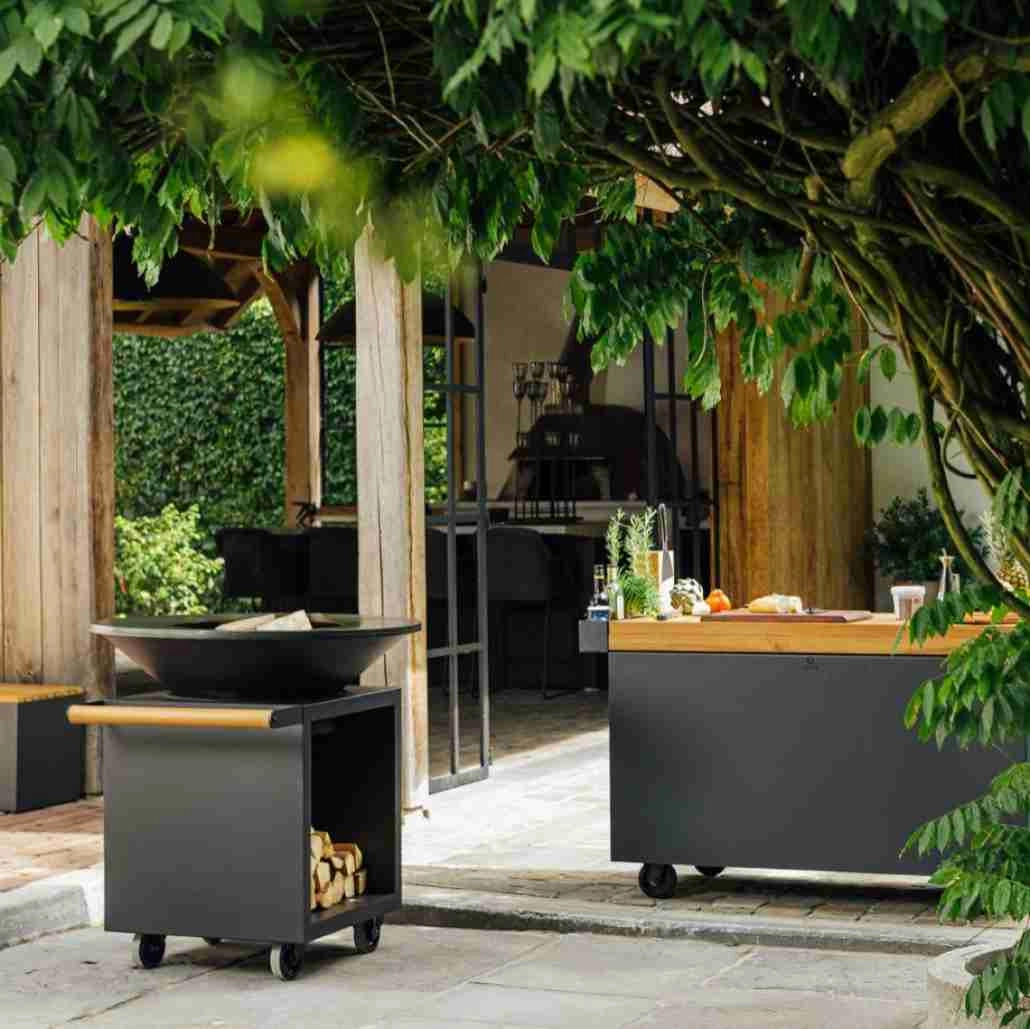 Grill modern, cu spatiu de stocare a lemnelor, care aduna in jurul mancarii si al focului pe toti prietenii tai! Experienta de a gati in exterior cu ajutorul gratarului pe lemne cu plita OFYR este speciala de fiecare data!