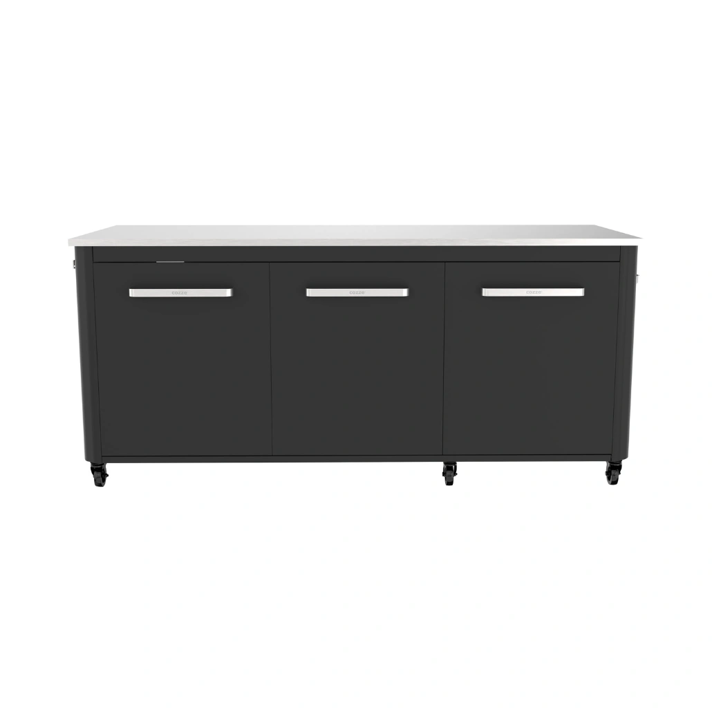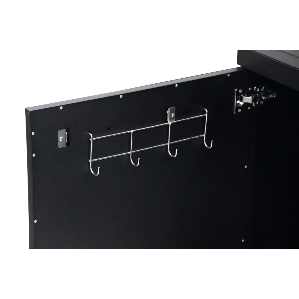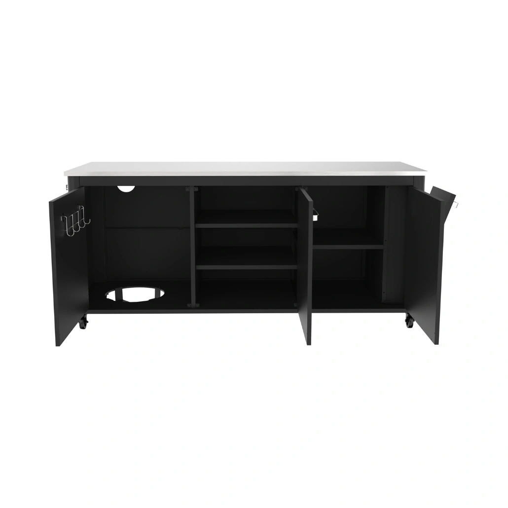 Amplasati dulapul in zona de bucatarie exterior pe o suprafata plana si stabila. Deschideti usile pentru a accesa spatiul generos de depozitare si folositi blat-ul din otel inoxidabil ca suprafata de lucru pentru prepararea ingredientelor.