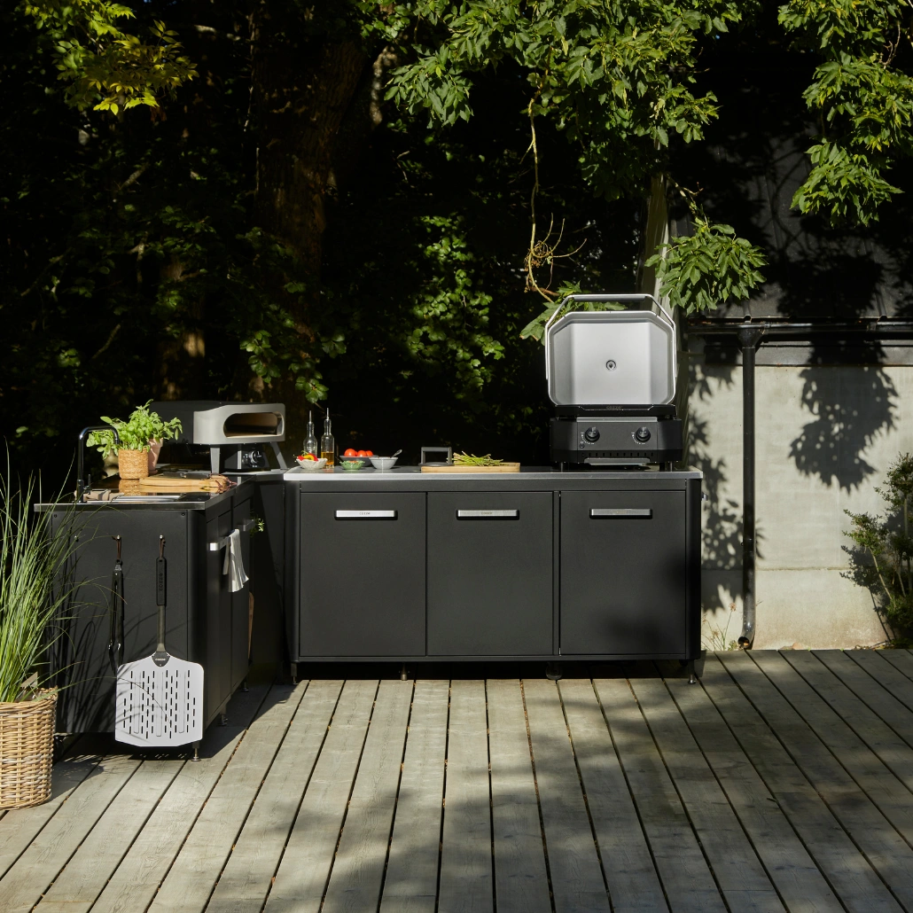 Organizati ustensilele si accesoriile pe rafturile si carligele integrate, astfel incat sa aveti totul la indemana in timpul sesiunilor de gatit in aer liber. Astfel, mobilitatea si functionalitatea acestei mobile pentru bucatarie exterior se vor dovedi esentiale pentru un spatiu de lucru practic si ordonat.