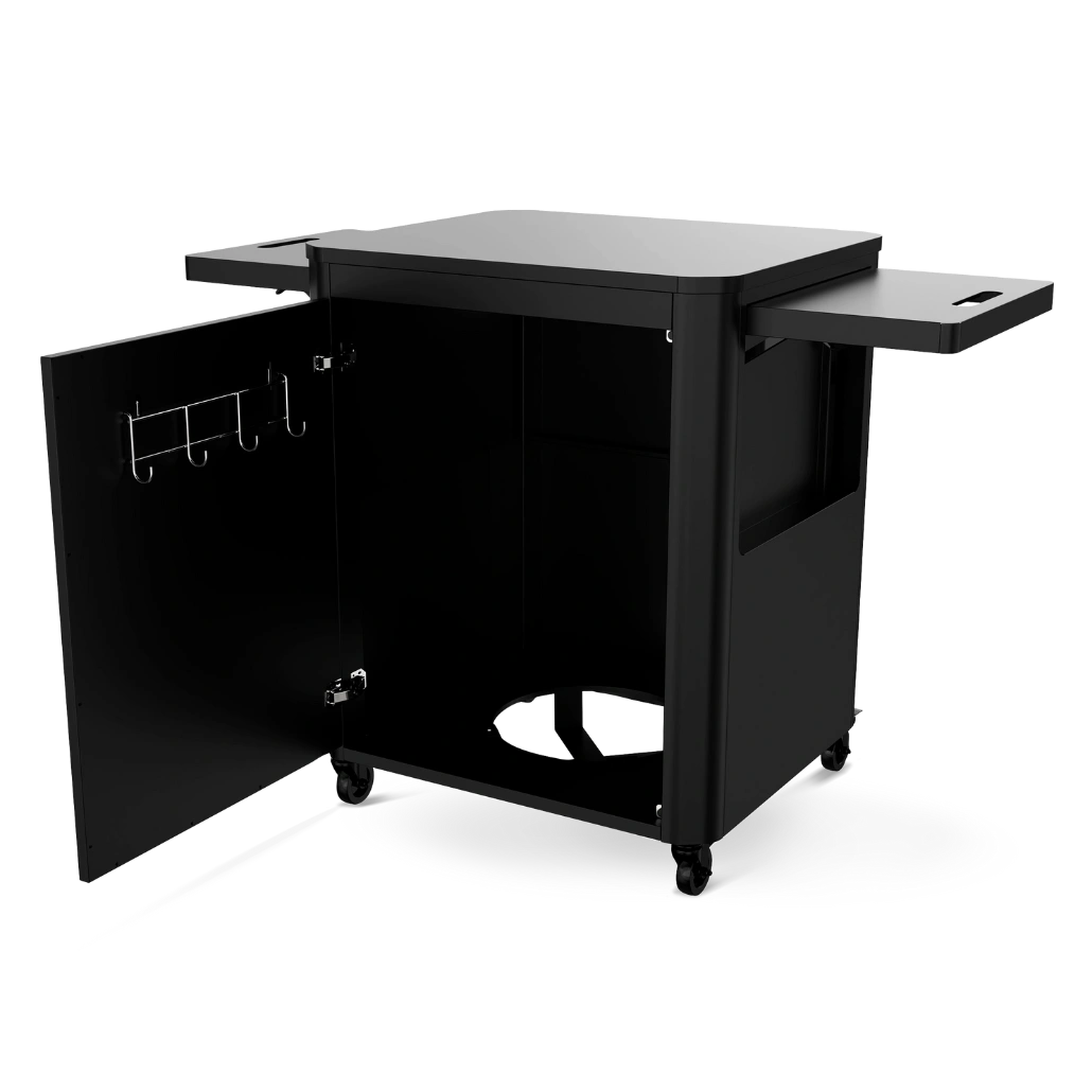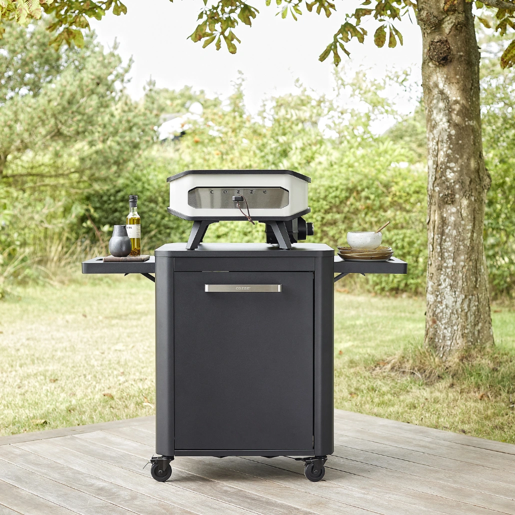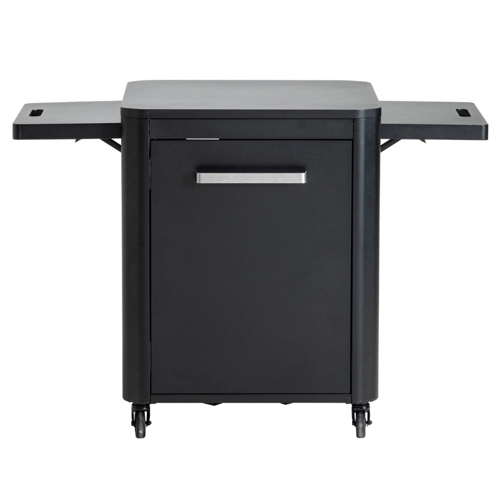 Amplaseaza dulapul pe o suprafata plana si asigura-te ca rotile sunt blocate pentru stabilitate. Deschide usile pentru a accesa compartimentele de depozitare si ajusteaza rafturile laterale pentru a organiza ustensilele, astfel incat totul sa fie la indemana in timpul gatitului in aer liber.