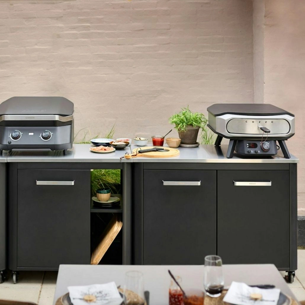 Pachetul Pro Pack Cozze iti ofera tot ce ai nevoie pentru o experienta culinara in aer liber: cuptorul pe gaz de 42.5 cm cu piatra rotativa, termometru digital si iluminare LED, alaturi de o bucatarie exterioara din inox cu blat spatios de 90 cm si modul cu chiuveta integrata, solutia completa pentru preparate delicioase si confort pe terasa sau in gradina.
